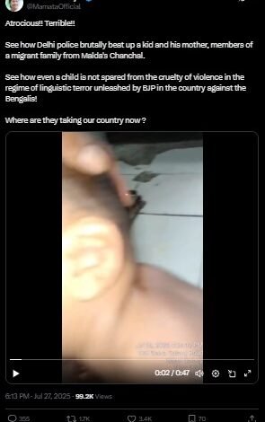 ঘটনার তীব্র নিন্দা করেছেন মুখ্যমন্ত্রী মমতা বন্দ্যোপাধ্যায়। X হ্যান্ডেলে শেয়ার করা ৪৭ সেকেন্ডের ভিডিওতে তিনি লিখেছেন— “দেখুন, দিল্লি পুলিশ কী নিষ্ঠুরভাবে মারছে এক শিশু ও তার মাকে! ভাষা সন্ত্রাসে শিশুও রেহাই পাচ্ছে না। দেশকে কোথায় নিয়ে যাচ্ছে এরা?”